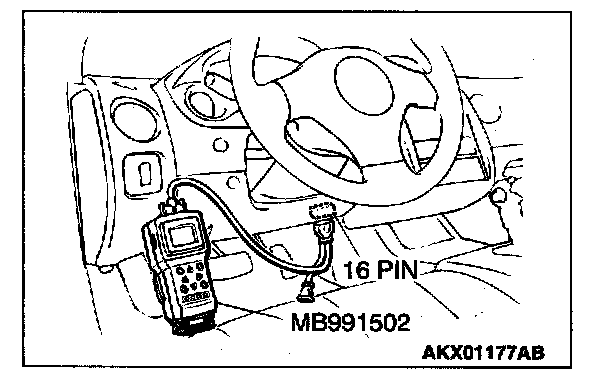 CAUTION: To prevent damage to scan tool MB991502, always turn the ignition switch to the "LOCK" (OFF) position before connecting or disconnecting scan tool MB991502.
