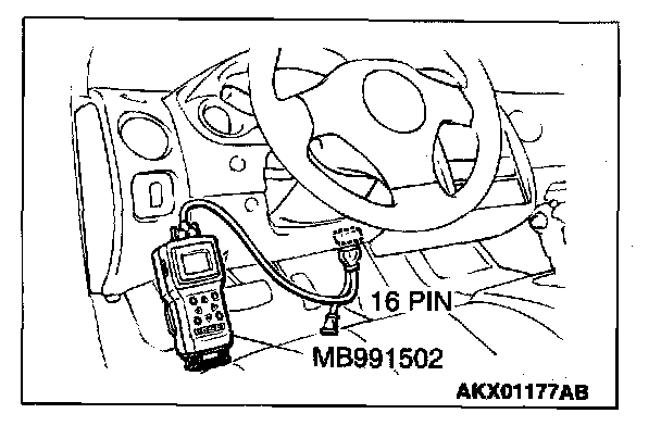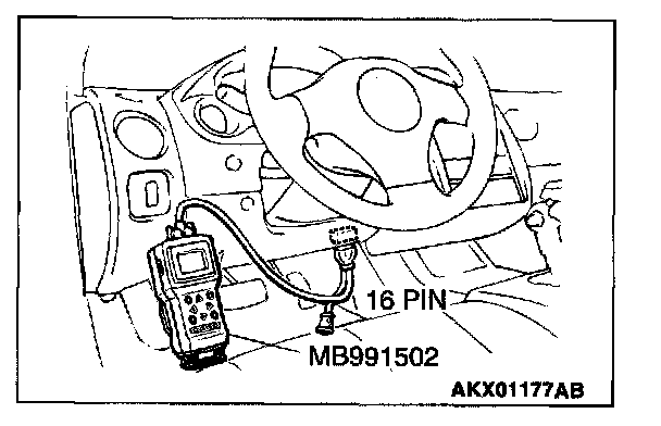 CAUTION: To prevent damage to scan tool MB991502, always turn the ignition switch to the "LOCK" (OFF) position before connecting or disconnecting scan tool MB991502.