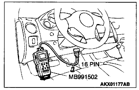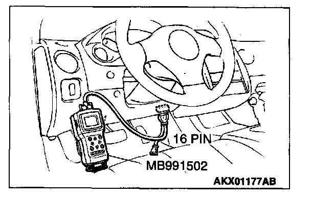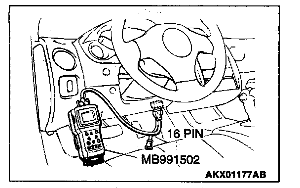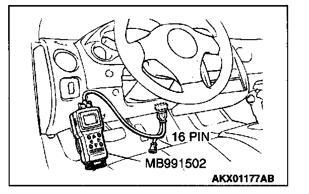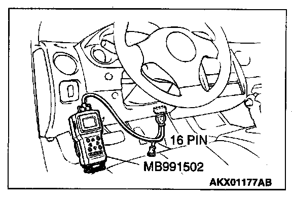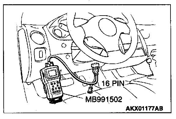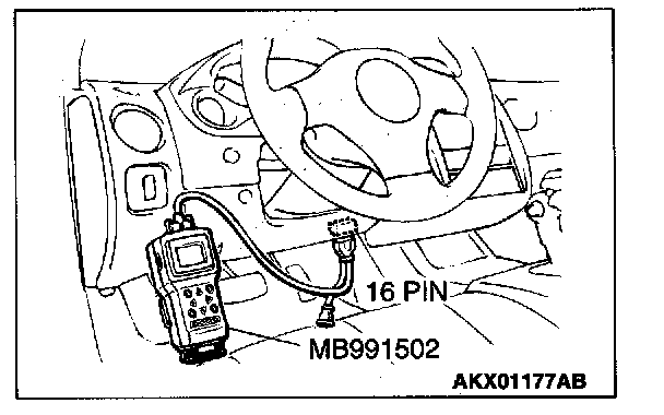 CAUTION: To prevent damage to scan tool MB991502, always turn the ignition switch to the "LOCK" (OFF) position before connecting or disconnecting scan tool MB 991502.