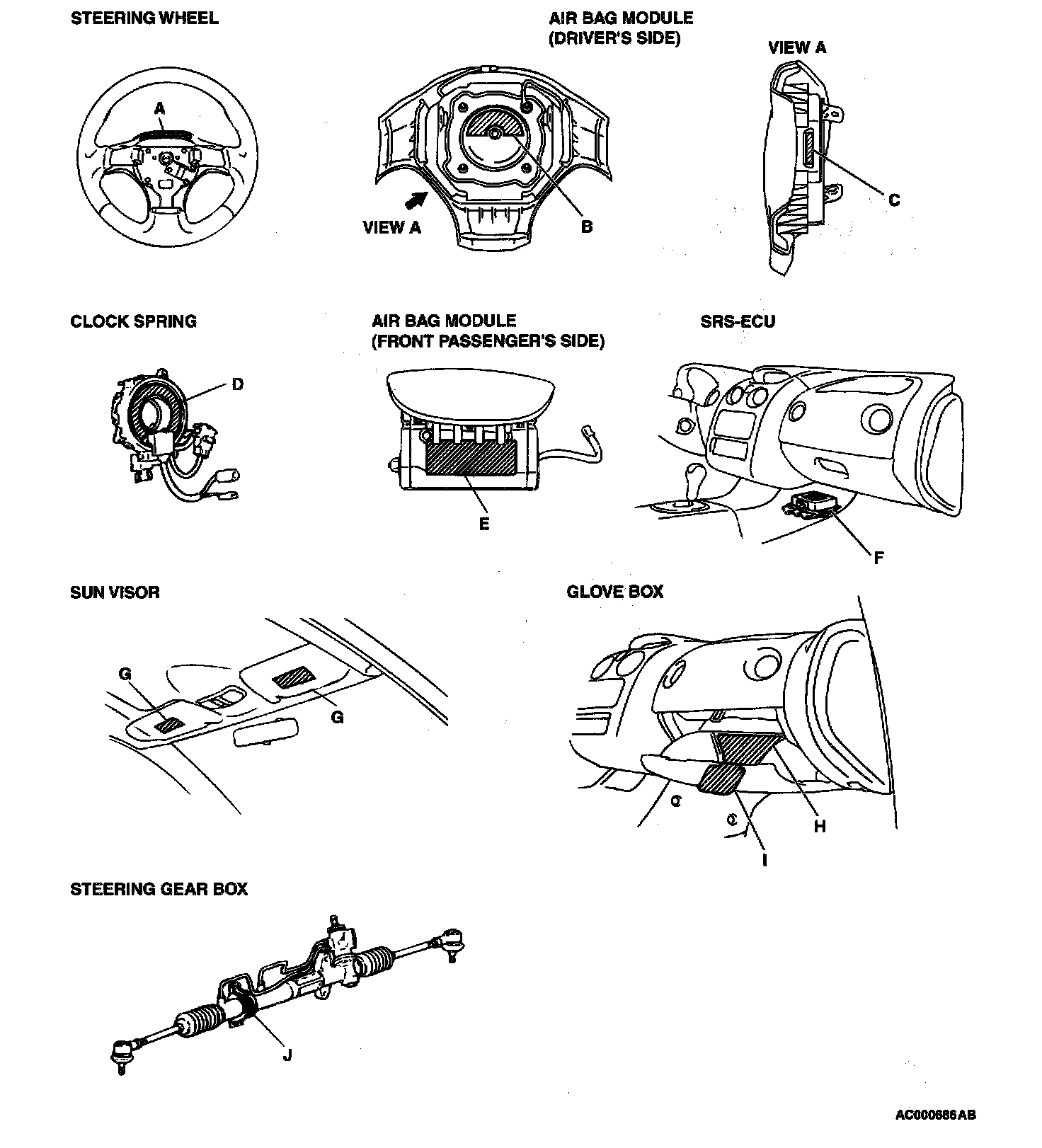 A number of caution labels related to the SRS are found in the vehicle, as shown in the following illustration. Follow label instructions when servicing SRS. If labels are dirty or damaged, replace them.