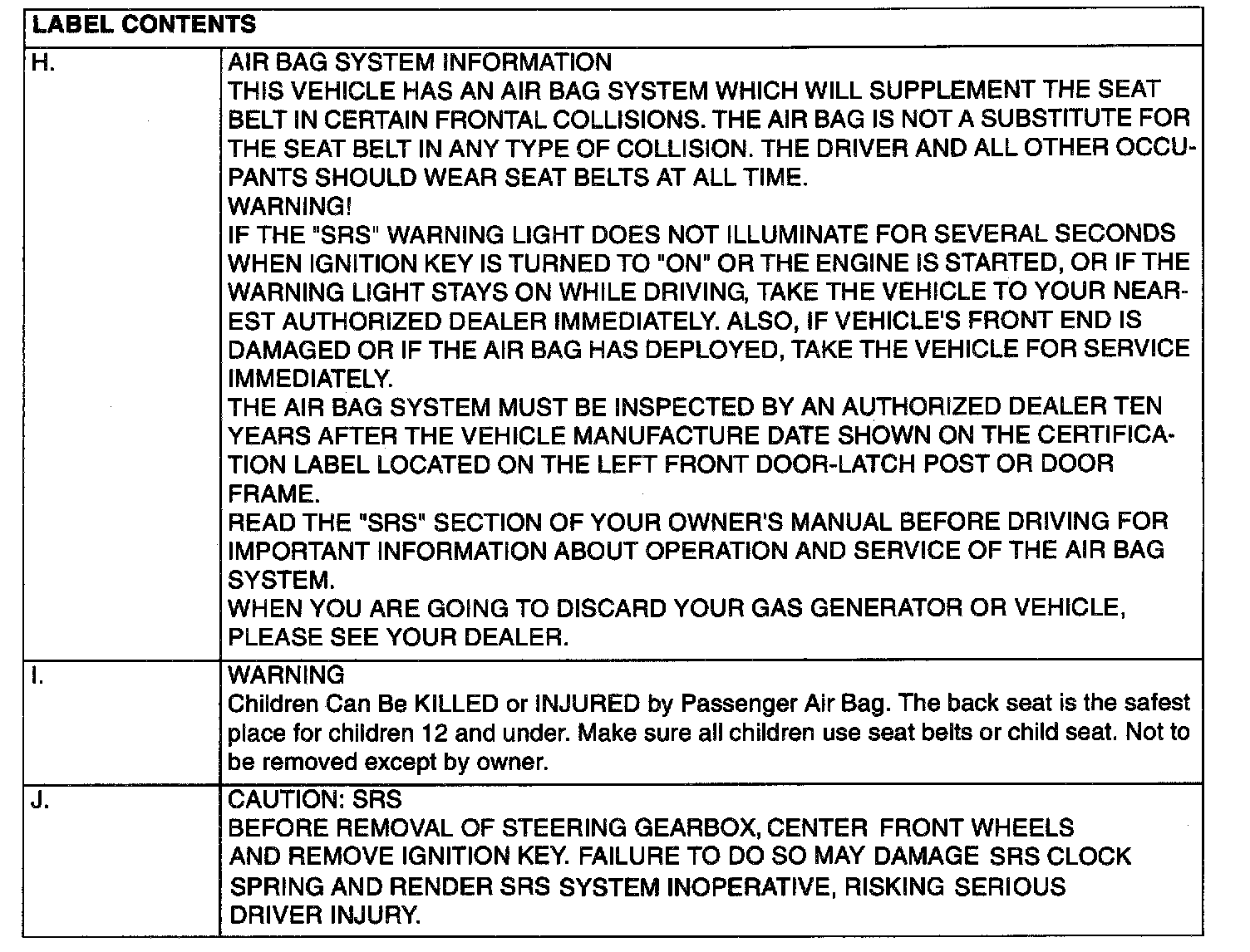 3. Warning labels must be heeded when servicing or handling SRS components. Warning labels can be found in the following locations.