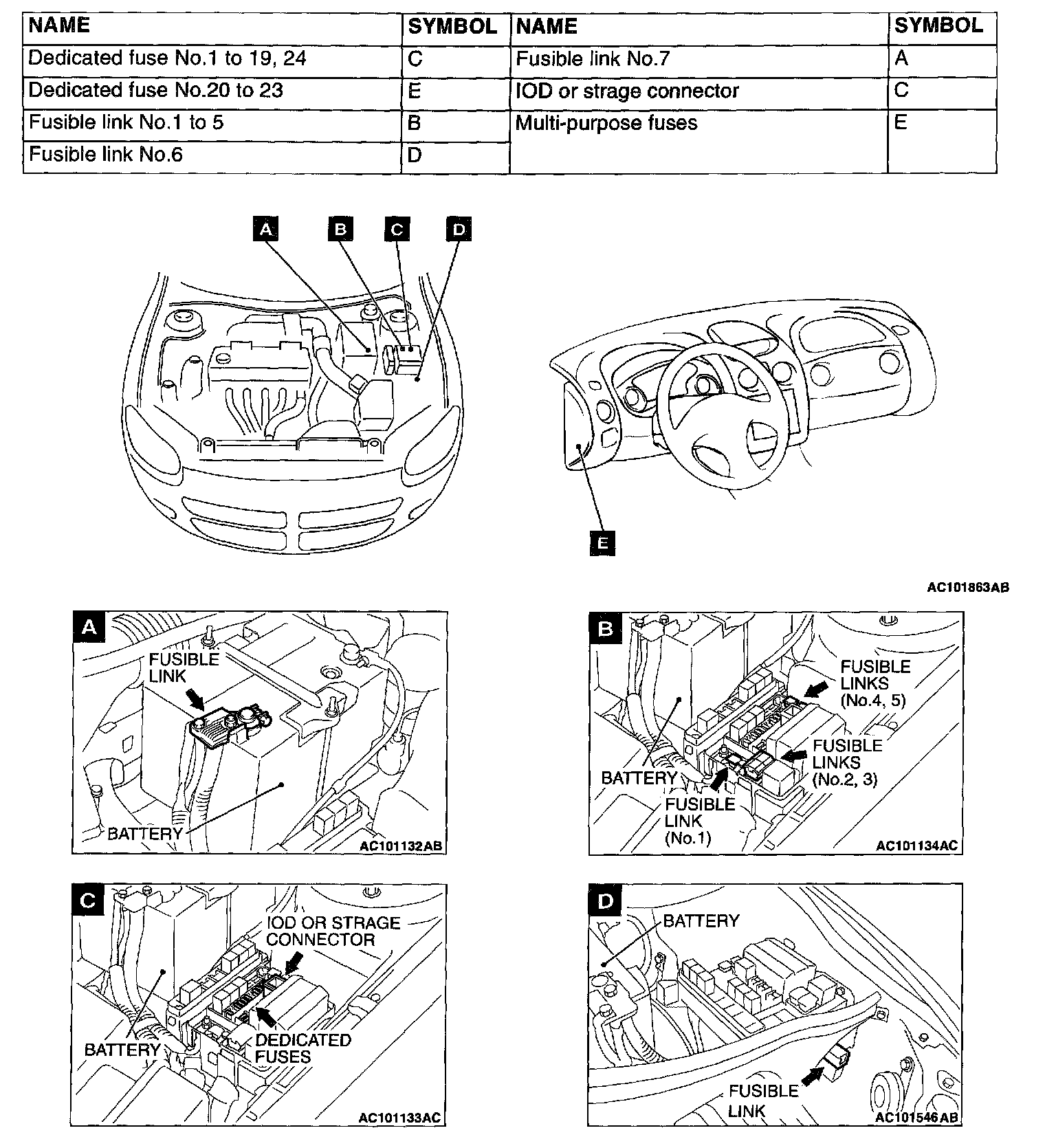 Fusible Link, Fuse And IOD Or Storage Connector Location Index, Overall View And Views A - D:
