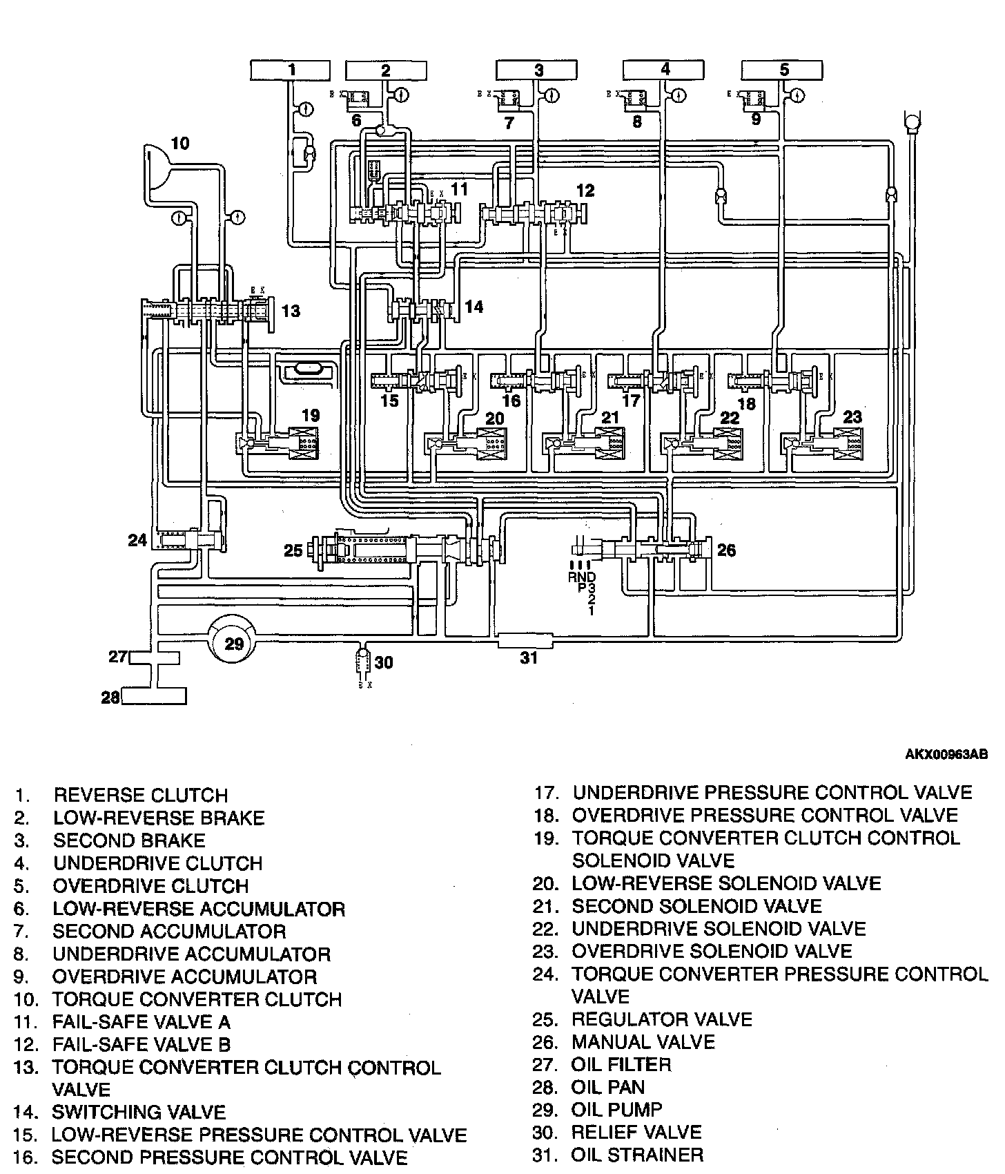 Parts related to oil pressure regulation are the oil pump, which pressurizes the oil; the regulator, which controls the pressure setting; the solenoid valves, which changes the oil pressure with electrical signals; the pressure control valve, which controls the oil pressure coming from the solenoid valve that effects each clutch and brake; each kind of valve, which carry out the retention of the oil pressure through the lines; and finally the valve body, which houses all the valves.
