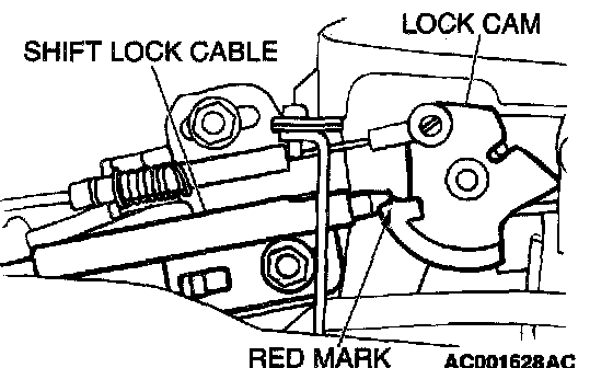 2. Fasten the shift lock cable at the position where the end of the shift lock cable is positioned above the red" mark.