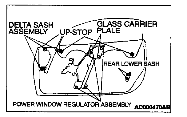 NOTE: IF the clearance is too small, the glass catch will move above the glass when the door is closed. If the clearance is too large, wind noise may be generated at high vehicle speeds because the glass catch is not hooked onto the glass.
