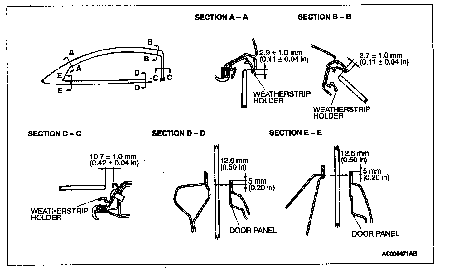 4. Tighten the power window regulator assembly upper bolts and the glass carrier plate mounting bolts so that the clearances between the weatherstrip holder and the window glass as well as between the door panel and the window glass meet the respective standard values. (sections A - A, B - B, C - C, D - D, E - E.)