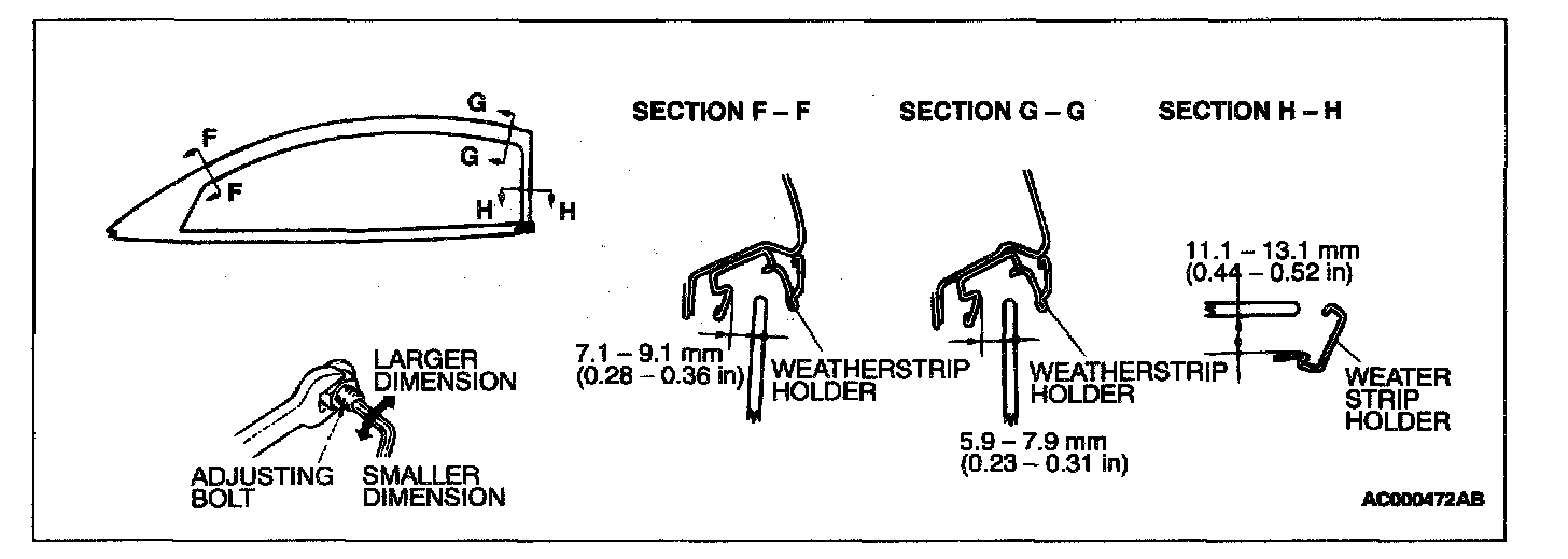5. Turn the lower adjusting bolts (right and left) of the power window regulator assembly until the clearances between the weatherstrip and the window glass meet the respective standard values. (sections F - F, G - G, H - H.)