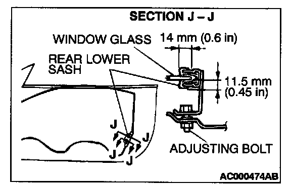 8. Tighten the adjusting bolts (upper and lower) until the rear lower sash is positioned as shown in the illustration, and then lock the nuts place.