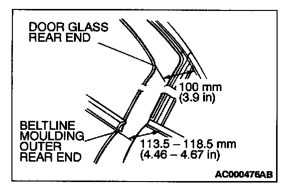 1. Close the door window glass fully, and close the door until the clearance between the door window glass rear end and the weatherstrip reaches 100 mm (3.9 inches). At this time, the distance between the rear end of the belt line molding outer and the quarter panel should be 113.5 - 118.5 mm (4.46 - 4.67 inches).