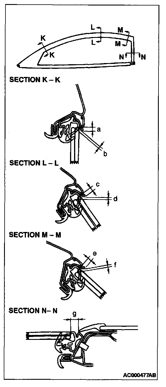 3. The amount of catch of the door catch on the door glass and the weatherstrip should be at the standard values b, d, f: when the window is closed fully and then the door is closed.