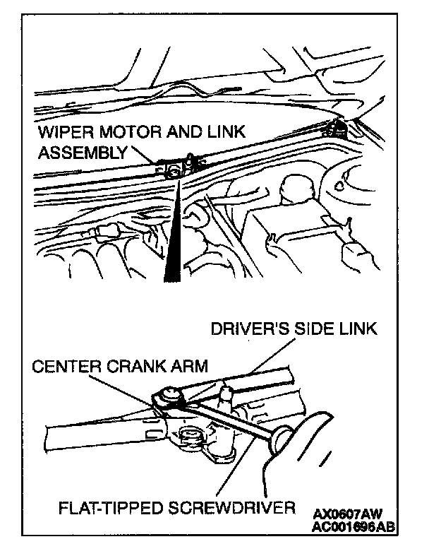 CAUTION: Be careful not to damage the windshield glass when removing the wiper motor and link assembly.