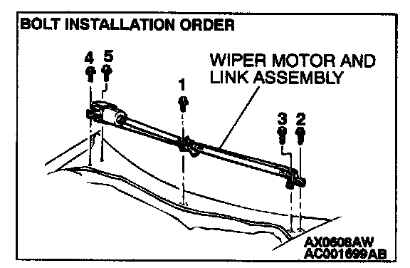 4. Install the four mounting bolts in the shown order to install the wiper motor and link assembly.