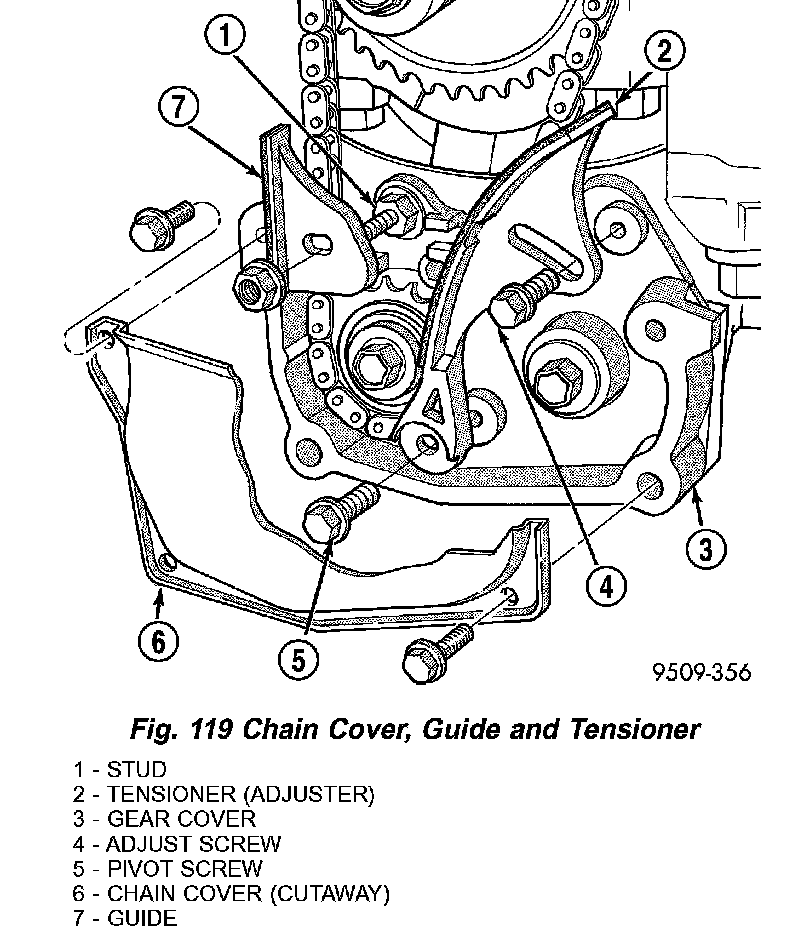4. Remove chain cover, guide and tensioner (Fig. 119).
