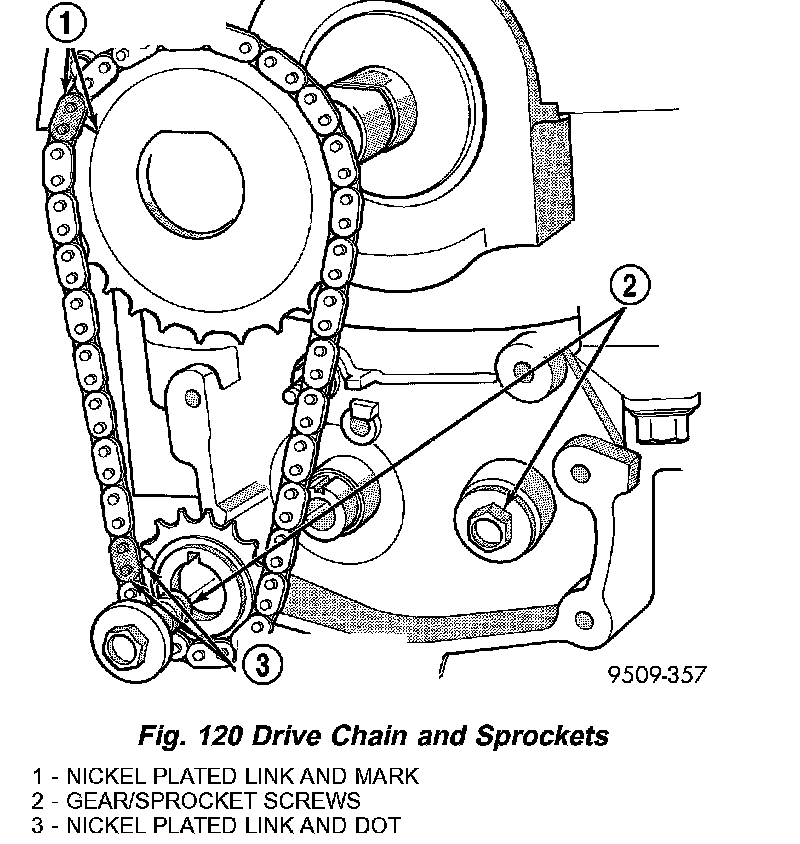 NOTE: THE TIMING MARK ON THE SPROCKET, THE (LOWER) NICKEL PLATED LINK, AND THE ARROW ON THE SIDE OF THE GEAR COVER SHOULD LINE UP WHEN THE BALANCE SHAFTS ARE TIMED CORRECTLY.