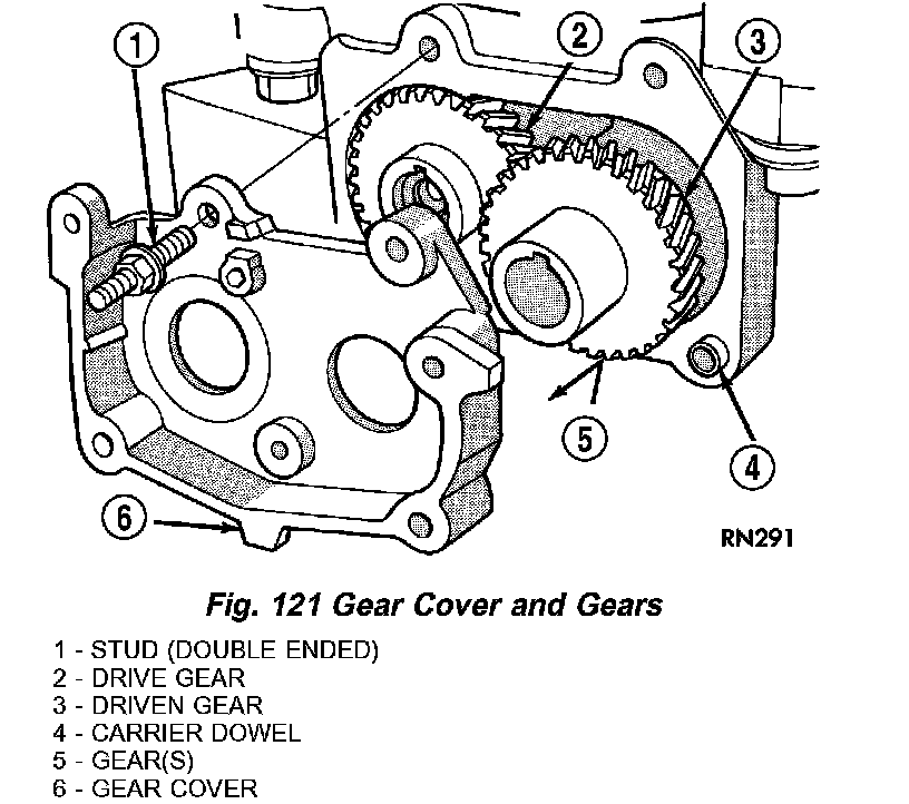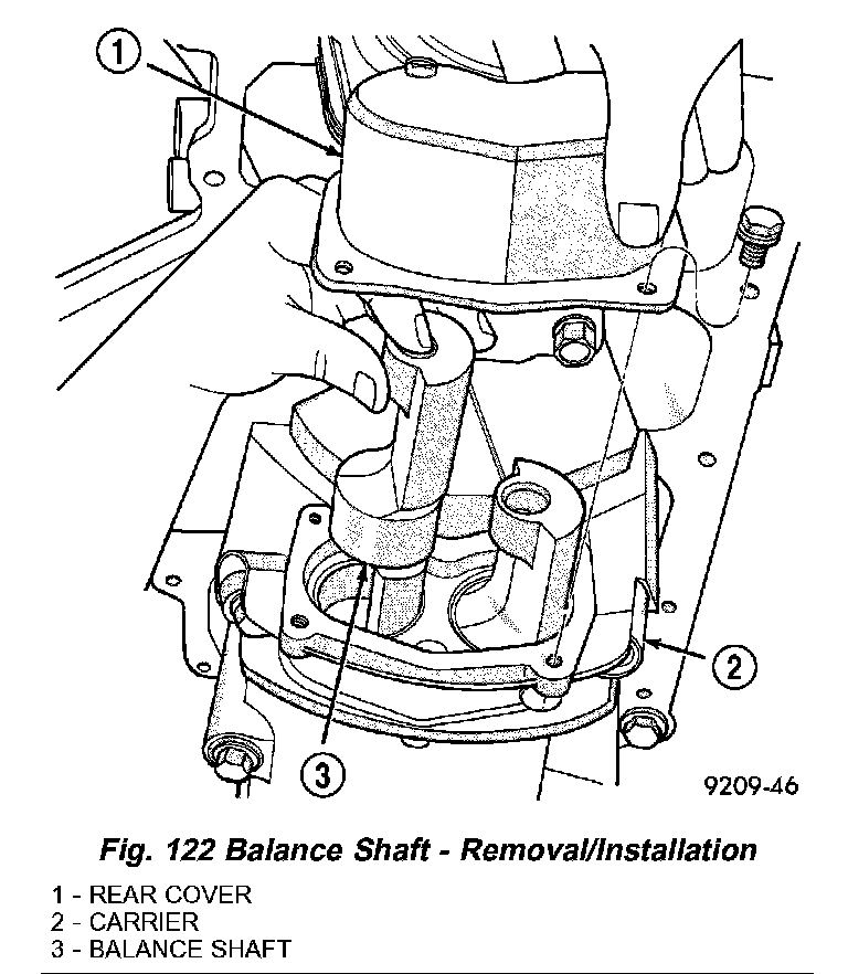 The following components will remain intact during carrier removal: Gear cover, gears, balance shafts and the rear cover (Fig. 118).