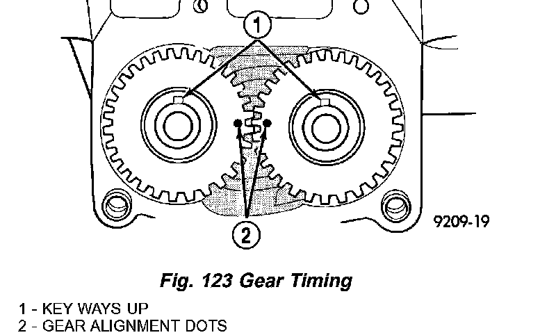 2. Turn balance shafts until both shaft key ways are up, parallel to vertical centerline of engine. Install short hub drive gear on sprocket driven shaft and long hub gear on gear driven shaft. After installation gear and balance shaft keyways must be up with gear timing marks meshed as shown in (Fig. 123).