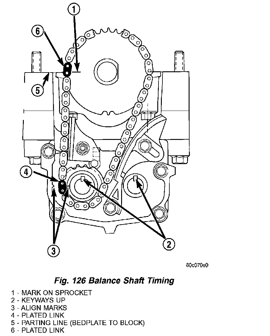 7. Place chain over crankshaft sprocket so that the plated link of the chain is over the number 1 cylinder timing mark on the balance shaft crankshaft sprocket (Fig. 126).