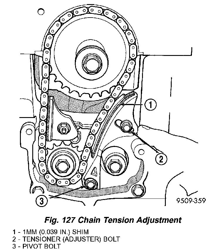 c. Place a shim 1 mm (0.039 in.) thick x 70 mm (2.75 in.) long between tensioner and chain. Push tensioner and shim up against the chain. Apply firm pressure 2.5 - 3 Kg (5.5 - 6.6 lbs.) directly behind the adjustment slot to take up all slack. Chain must have shoe radius contact as shown in (Fig. 127).