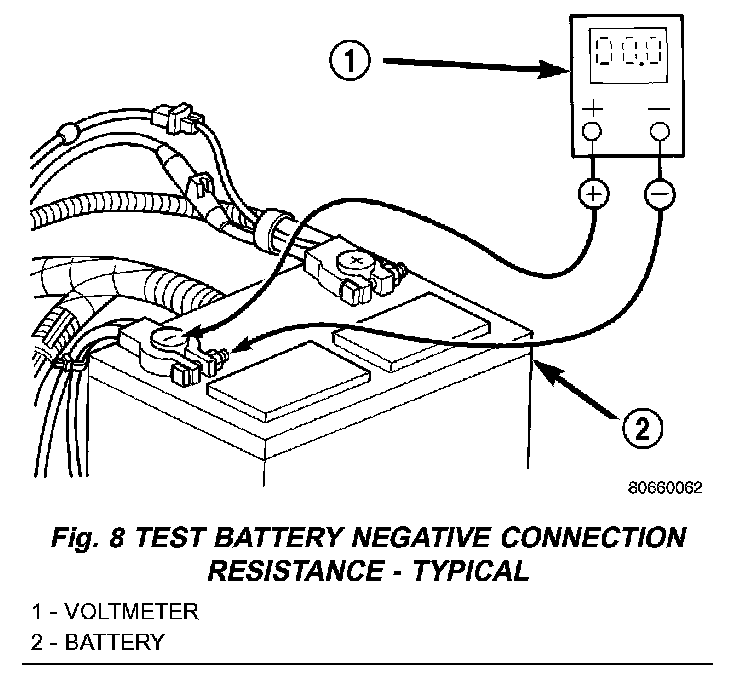 1. Connect the positive lead of the voltmeter to the battery negative terminal post. Connect the negative lead of the voltmeter to the battery negative cable terminal clamp (Fig. 8). Rotate and hold the ignition switch in the Start position. Observe the voltmeter. If voltage is detected, correct the poor connection between the battery negative cable terminal clamp and the battery negative terminal post.