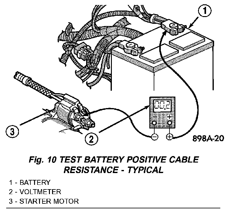 3. Connect the voltmeter to measure between the battery positive cable terminal clamp and the starter solenoid B(+) terminal stud (Fig. 10). Rotate and hold the ignition switch in the Start position. Observe the voltmeter. If the reading is above 0.2 volt, clean and tighten the battery positive cable eyelet terminal connection at the starter solenoid B(+) terminal stud. Repeat the test. If the reading is still above 0.2 volt, replace the faulty battery positive cable.