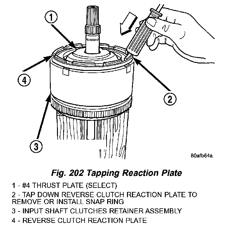 2. Tap down reverse clutch reaction plate to release pressure from snap ring (Fig. 202).