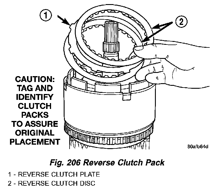 5. Remove the reverse clutch pack (two fibers/one steel) (Fig. 206).