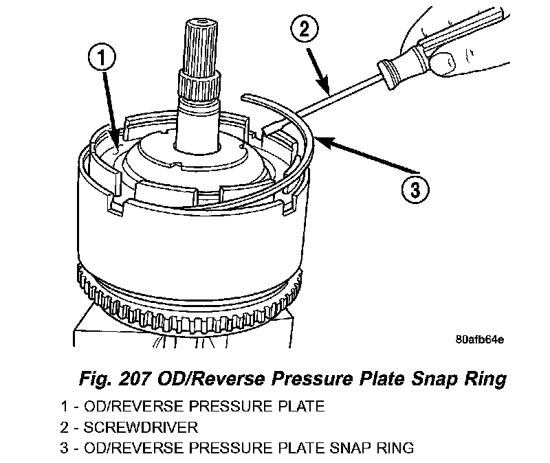 6. Remove the OD/Reverse pressure plate snap ring (Fig. 207).