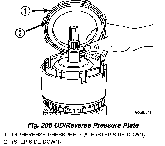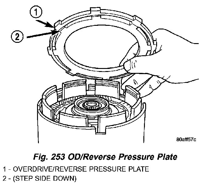 23. Install the OD/Reverse pressure plate with large step down (towards OD clutch pack) (Fig. 253).
