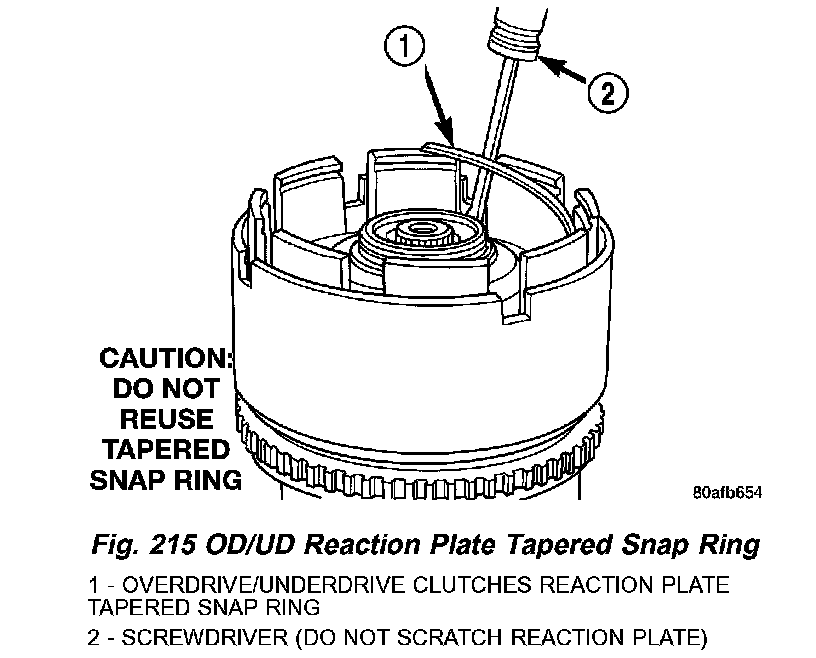 13. Remove the OD/UD reaction plate tapered snap ring (Fig. 215).