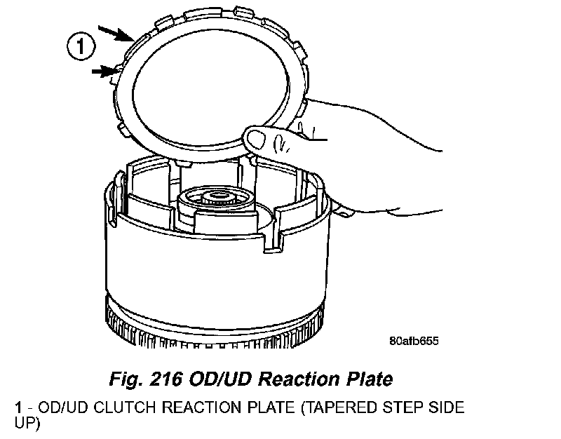 NOTE: The OD/UD clutch reaction plate has a step on both sides. Install the OD/UD clutches reaction plate tapered step side up.