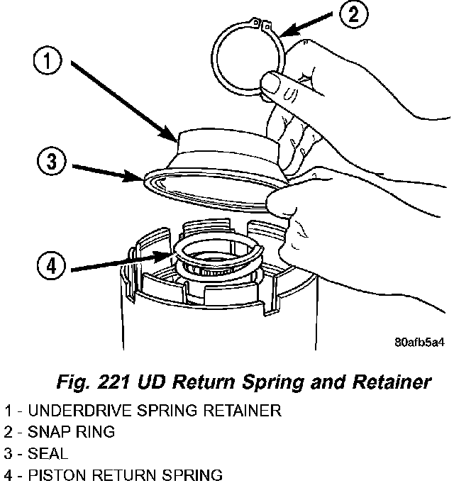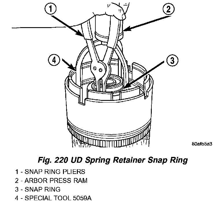 18. Using Tool 5059A and an arbor press, compress UD clutch piston enough to remove snap ring (Fig. 220) (Fig. 221).
