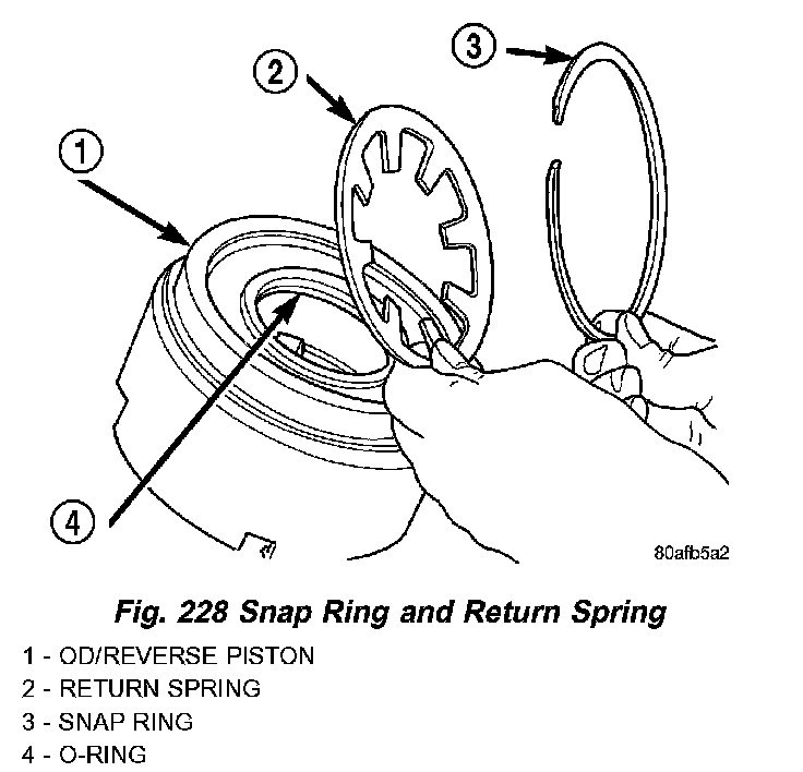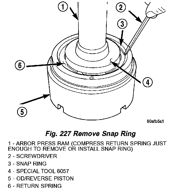 24. Using Tool 6057 and an arbor press, compress return OD/Reverse piston return spring just enough to remove snap ring (Fig. 227) (Fig. 228).