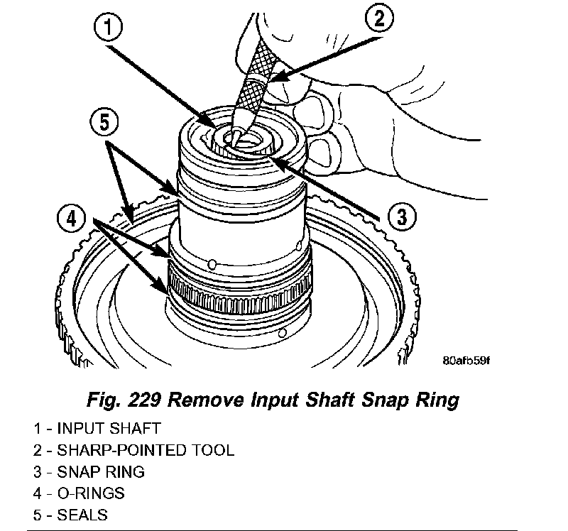 25. Remove input shaft to input clutch hub snap ring (Fig. 229).
