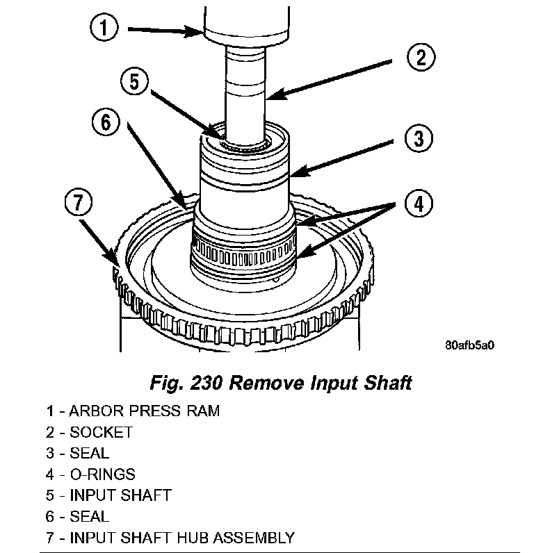 26. Using a suitably sized socket and an arbor press, remove input shaft from input shaft hub (Fig. 230).
