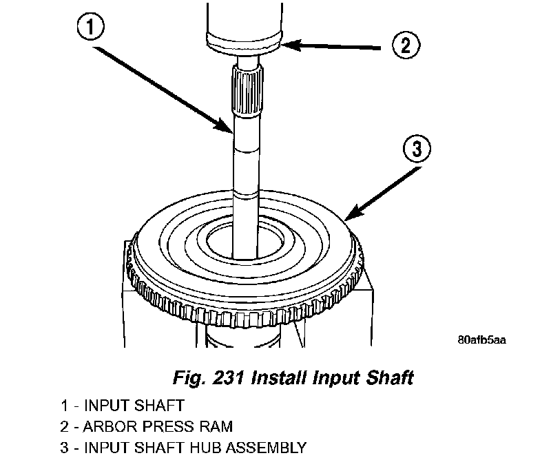 1. Using an arbor press, install input shaft to input shaft hub (Fig. 231).
