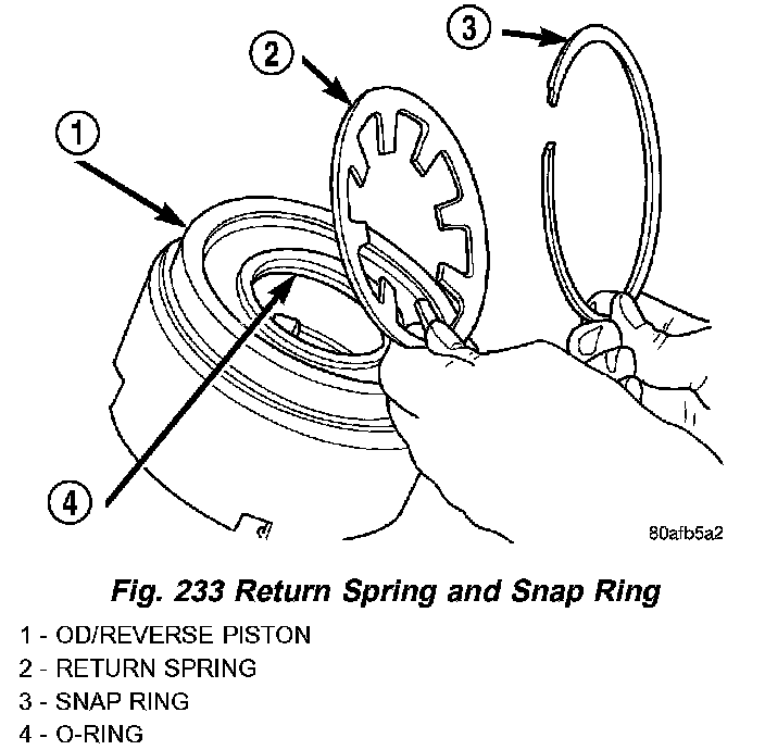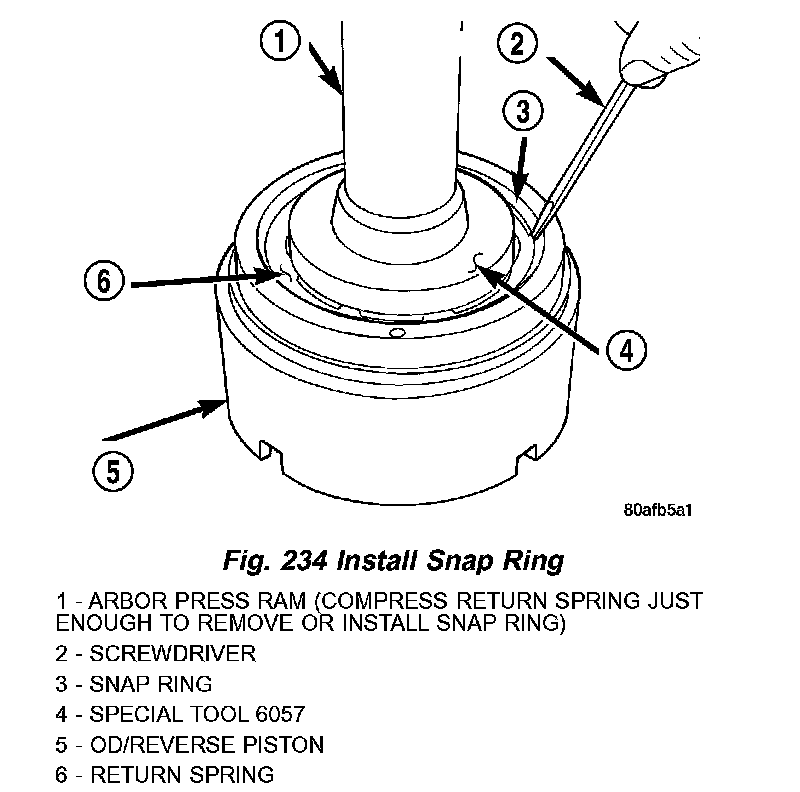 3. Using an arbor press and Tool 6057, Install OD/Reverse piston return spring and snap ring (Fig. 233) (Fig. 234).