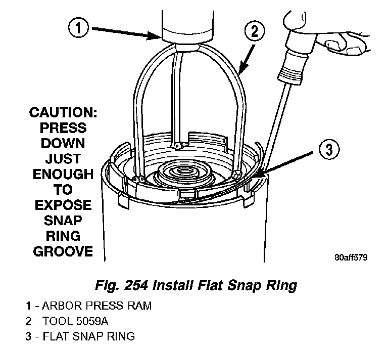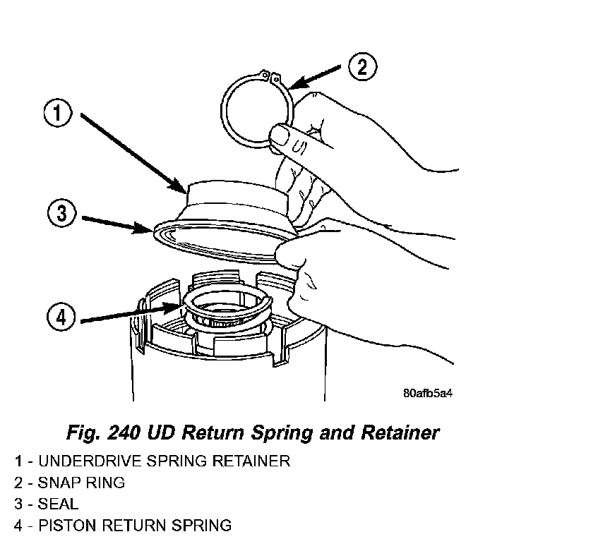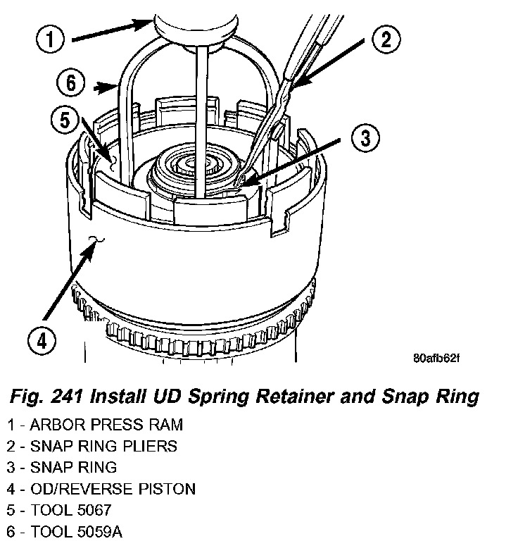9. Using Tool 5059A and an arbor press, Install the UD spring retainer and snap ring. (Fig. 240) (Fig. 241) Compress just enough to install snap ring.