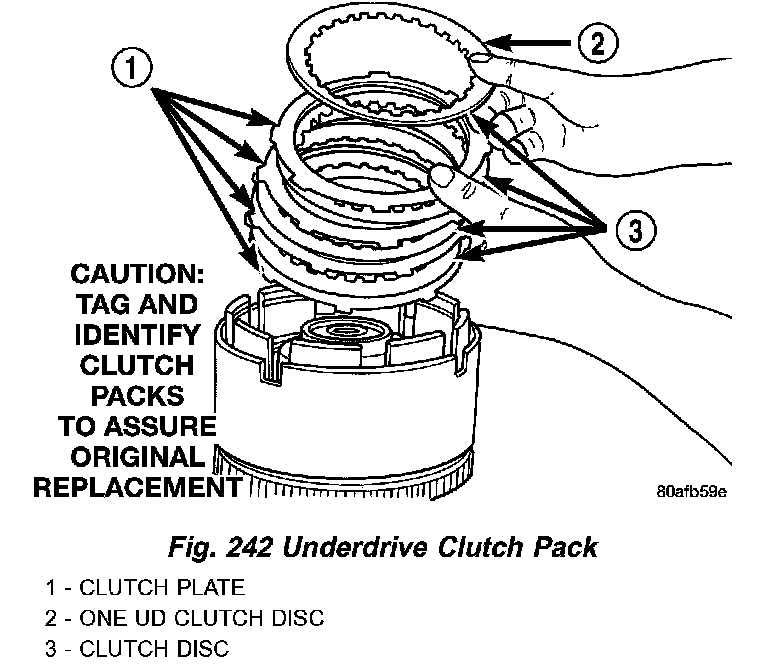 10. Install the UD clutch pack. Leave out upper disc, until snap ring is installed (Fig. 242).