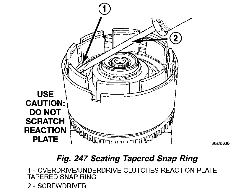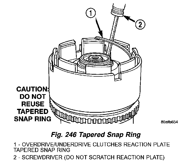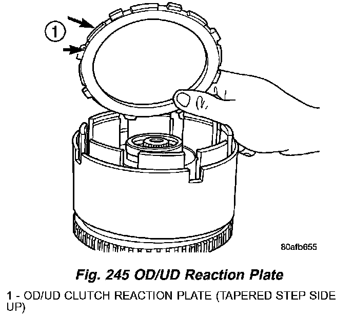 13. Install the OD/UD clutch reaction plate and snap ring (Fig. 245) (Fig. 246). The OD/UD clutches reaction plate has a step on both sides. Install the OD/UD clutches reaction plate tapered step side up.