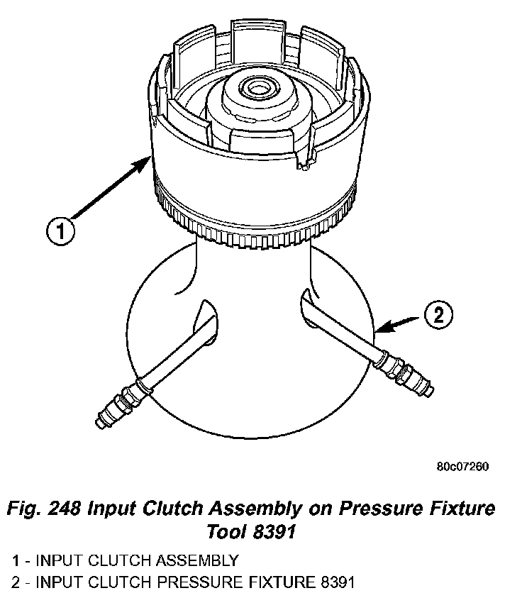 15. Install input clutch assembly to the Input Clutch Pressure Fixture-Tool 8391 (Fig. 248).