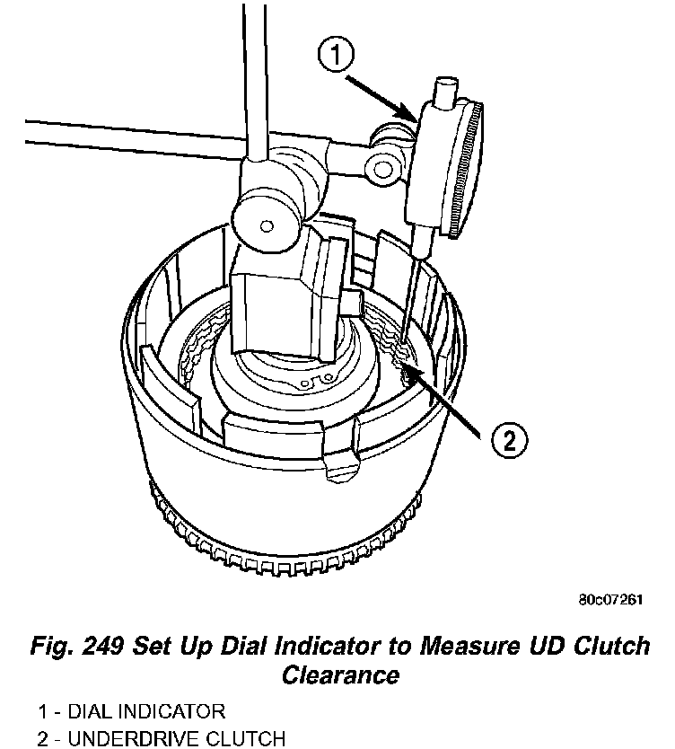 16. Set up dial indicator on the UD clutch pack as shown in (Fig. 249).