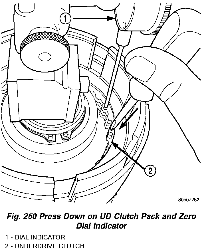 17. Using moderate pressure, press down and hold (near indicator) the UD clutch pack with screwdriver or suitable tool and zero dial indicator (Fig. 250). When releasing pressure on clutch pack, indicator reading should advance 0.005-0.010.