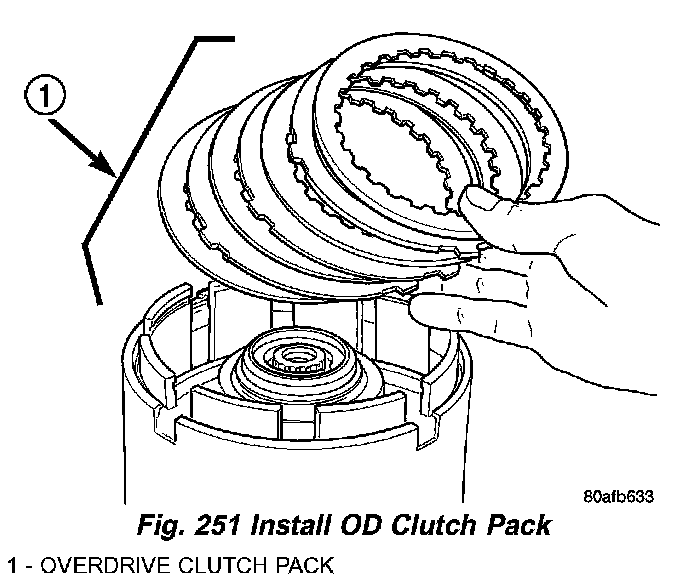 21. Install the OD clutch pack (four frictions/three steels) (Fig. 251).