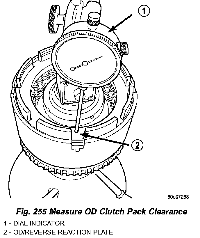 25. Measure OD clutch pack clearance. Set up dial indicator on top of the OD/Reverse pressure plate as shown in (Fig. 255).