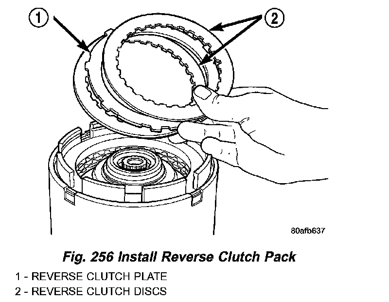 28. Install reverse clutch pack (two frictions/one steel) (Fig. 256).