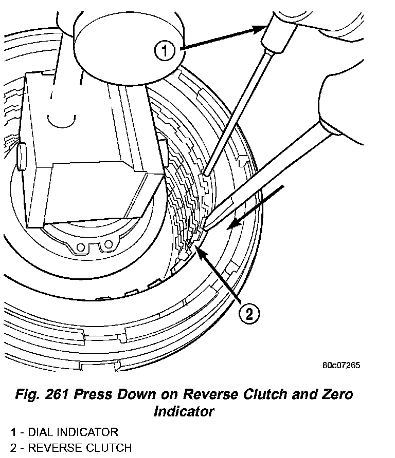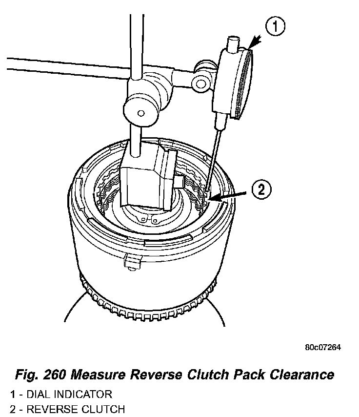 32. Set up a dial indicator on the reverse clutch pack as shown in (Fig. 260).