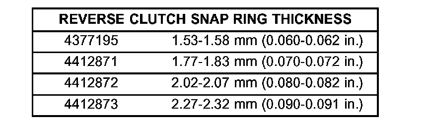 35. Take average of four measurements and compare with reverse clutch pack clearance specification. The reverse clutch pack clearance is 0.89 - 1.37 mm (0.035 - 0.054 inch). Select the proper reverse clutch snap ring to achieve specifications:
