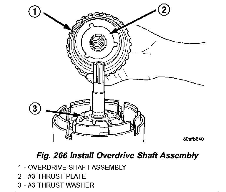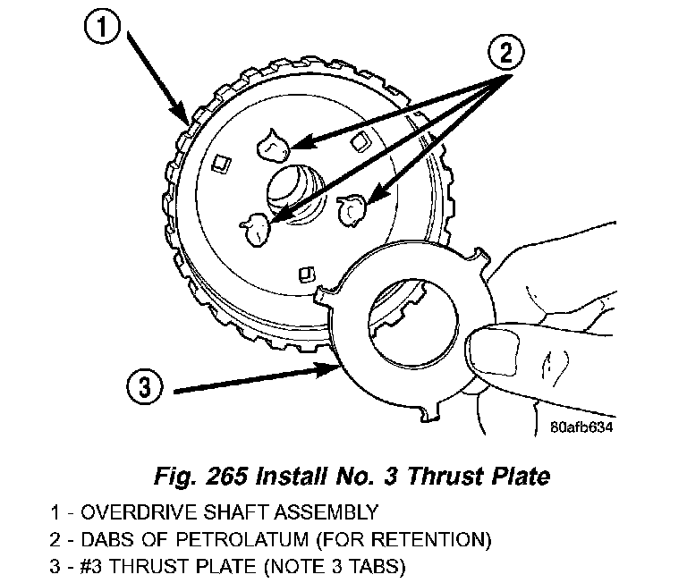 40. Install the # 3 thrust plate to the bottom of the overdrive shaft assembly. Retain with petrolatum or transmission assembly gel (Fig. 265).