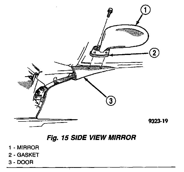 2. Remove bolts attaching side view mirror to door panel (Fig. 15).