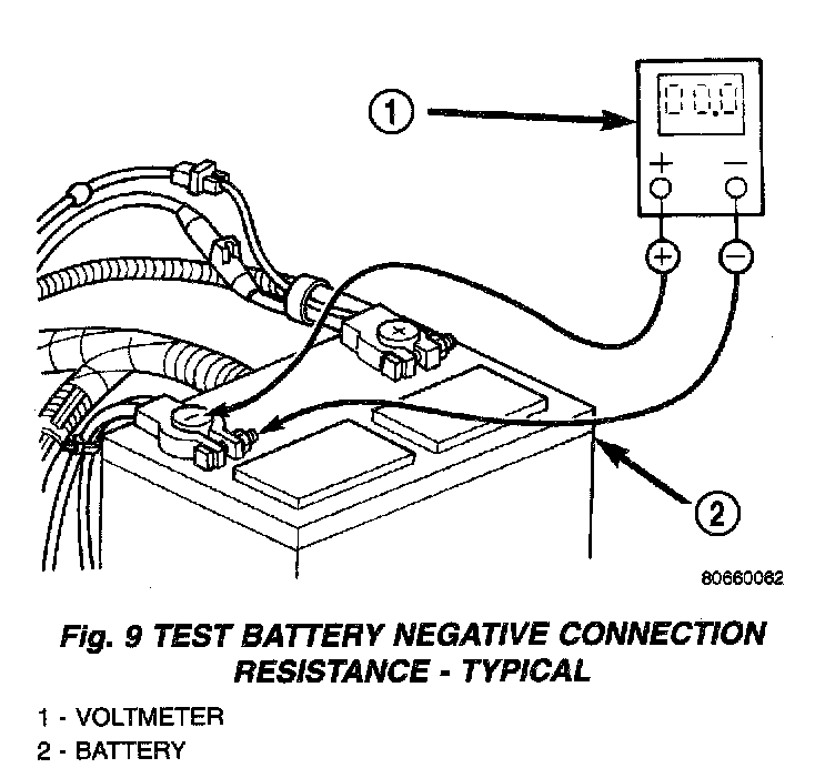 1. Connect the positive lead of the voltmeter to the battery negative terminal post. Connect the negative lead of the voltmeter to the battery negative cable terminal clamp (Fig. 9). Rotate and hold the ignition switch in the Start position. Observe the voltmeter. If voltage is detected, correct the poor connection between the battery negative cable terminal clamp and the battery negative terminal post.